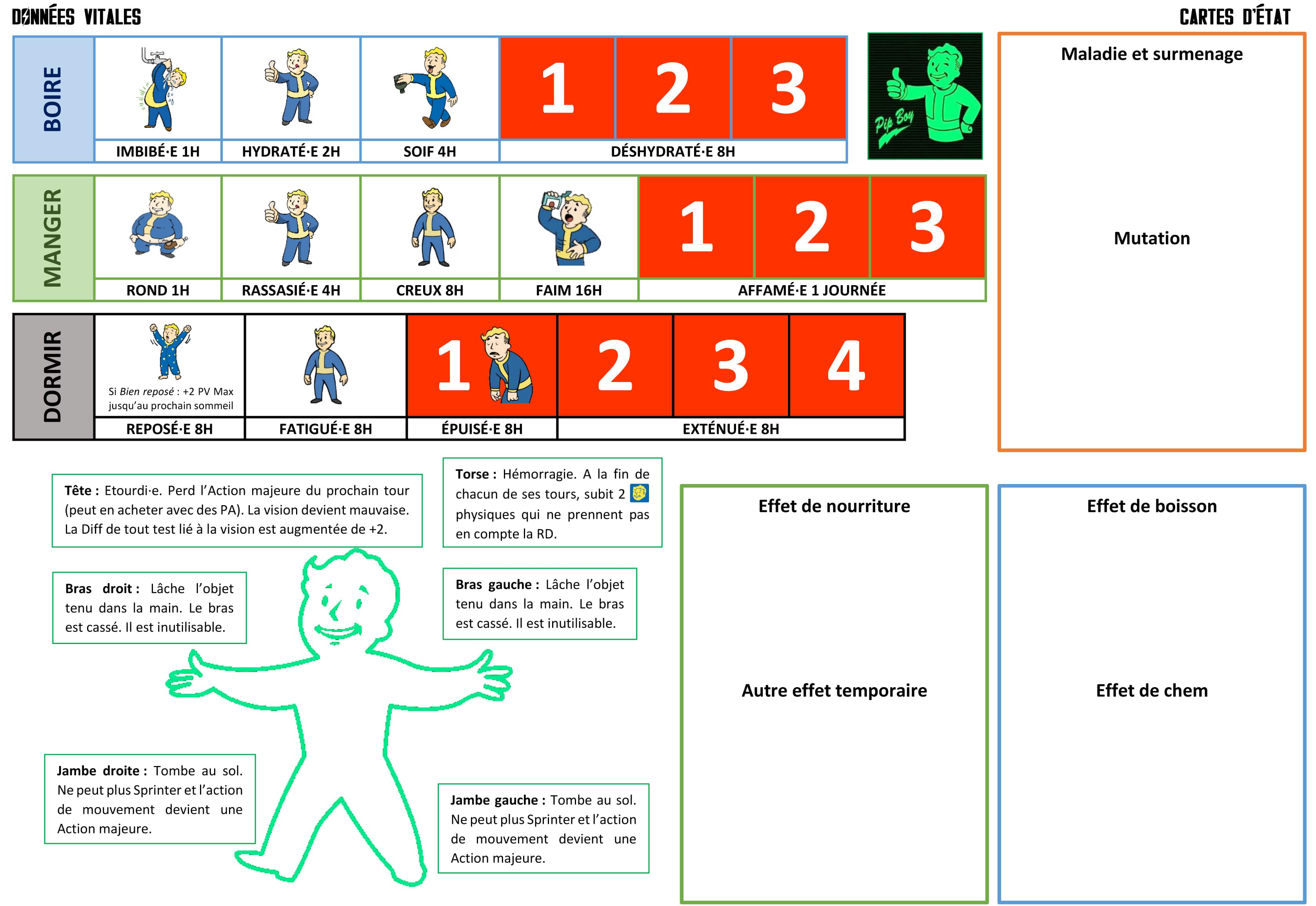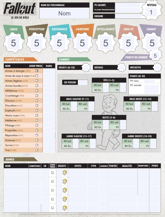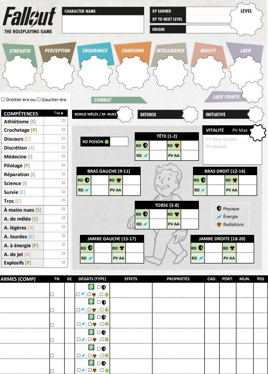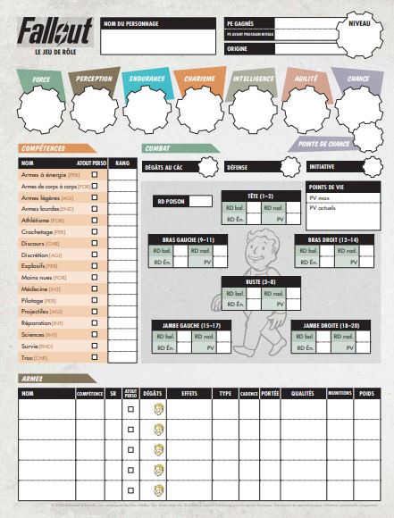 La fiche de personnage officiel du jeu de rôle Fallout.