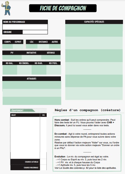 Il s'agit d'une fiche pour le suivi des compagnons, tel que décrit dans le supplément du guide des colonies. Il y a une version créature et une version personnage.