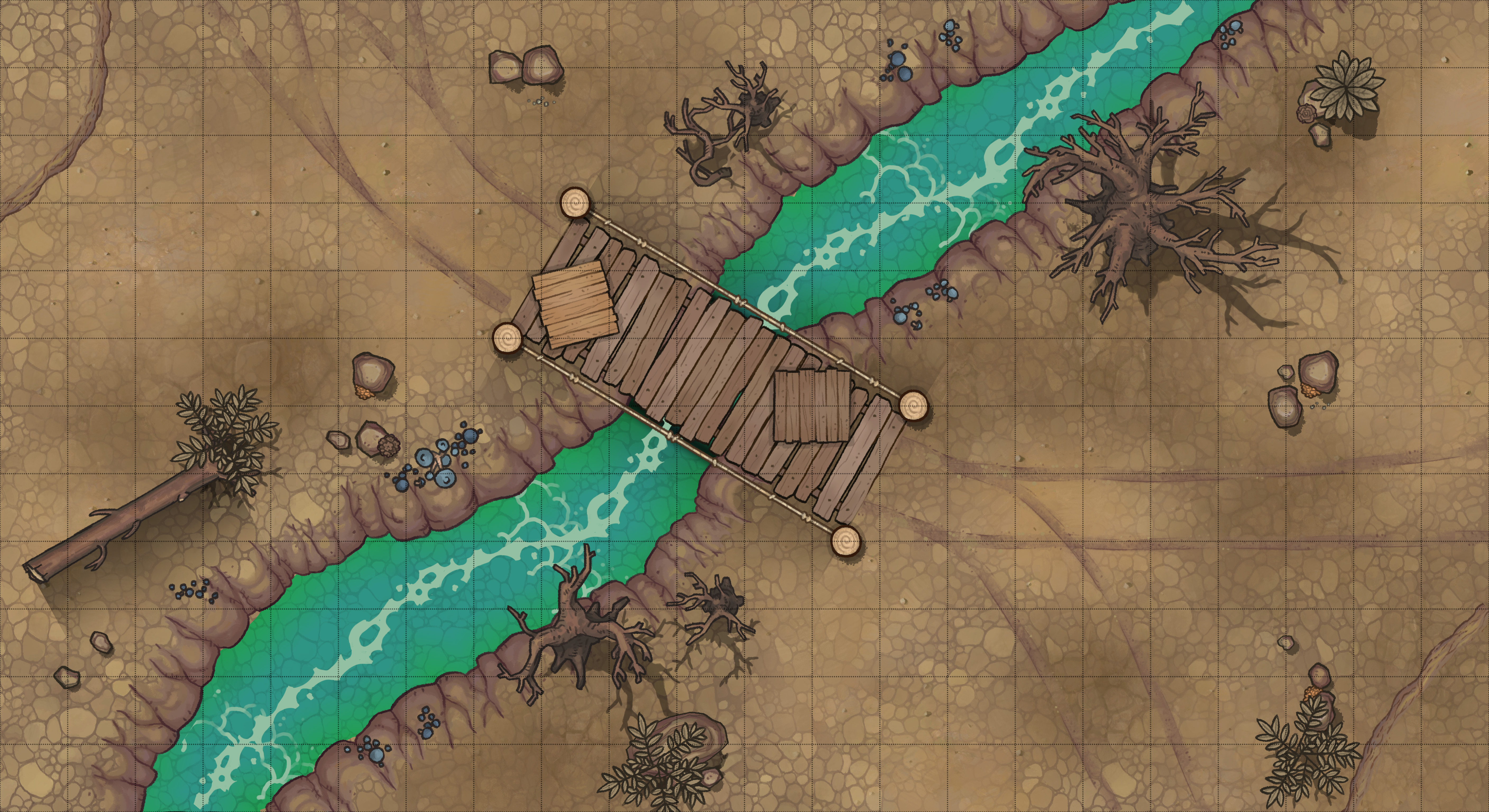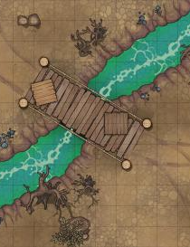 Une simple Carte 22X12 avec un pont en bois qui surplombe une rivière radioactive dans une zone désertique.